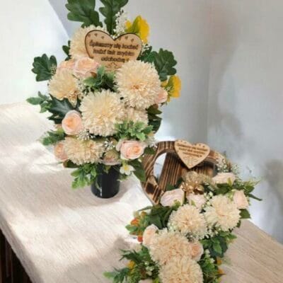 220,00 złPrzepiękny i niepowtarzalny komplet na cmentarz w jasnych kolorkach .Podstawa drewniana z sercem dodaje efektu cała kompozycja stworzona ręcznie jest niepowtarzalna każde nasze cudo jest wyjątkowe na żywo jeszcze piękniejsze. każdy element dobierany z ogromną starannością mocny solidnie skomponowany .Zapraszamy .