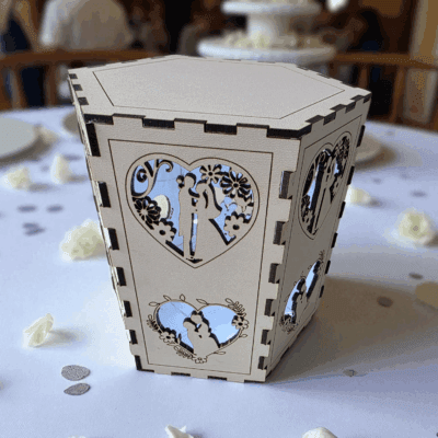 ✨ Lampion ślubny z MDF – romantyczna dekoracja z duszą ✨💍 📌 Wykonany z białej, dwustronnej płyty MDF 💡 Idealny na: ślub, prezent, dekorację stołu, sali, pokoju nowożeńców Ten wyjątkowy lampion został wykonany z precyzyjnie wycinanych elementów białej płyty MDF dwustronnej, co daje piękny, czysty efekt z każdej strony.Na ściankach znajdują się delikatne motywy zakochanych…